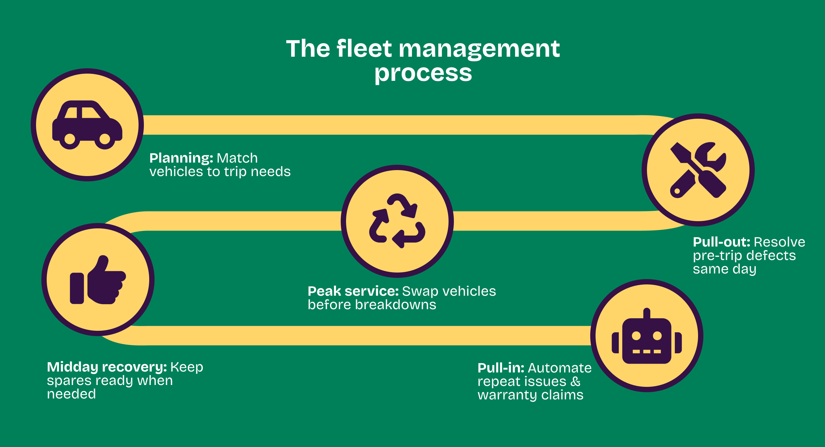 Begin where it matters most: pull-out reliability and peak-period performance. Bring together schedulers, dispatchers, shop leads, and parts managers. Map out a typical service day. Pinpoint the moments where handoffs break down. Then build a 90-day plan focused on: